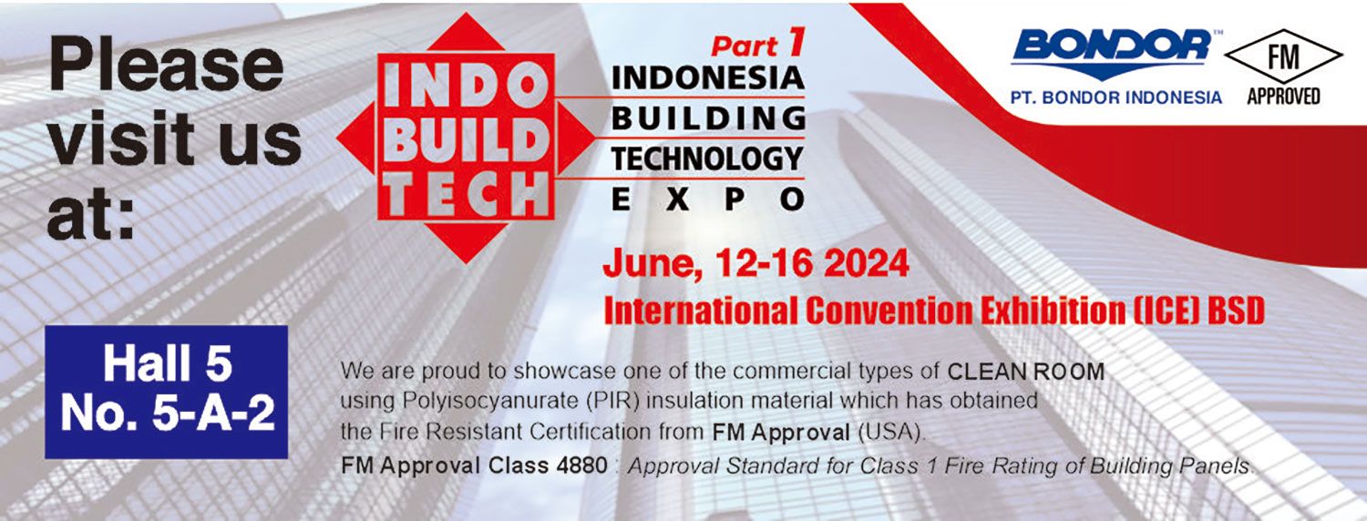 Bondor, the largest sandwich panel manufacturing company in Indonesia will be present at Indo Build Tech 2024 (June 12-16 2024). We are proud to showcase one of the commercial types of CLEAN ROOM using Polyisocyanurate (PIR) insulation material which has obtained the Fire Resistant Certification from FM Approval (USA). FM Approval Class 4880, Approval Standard for Class 1 Fire Rating of Building Panels.